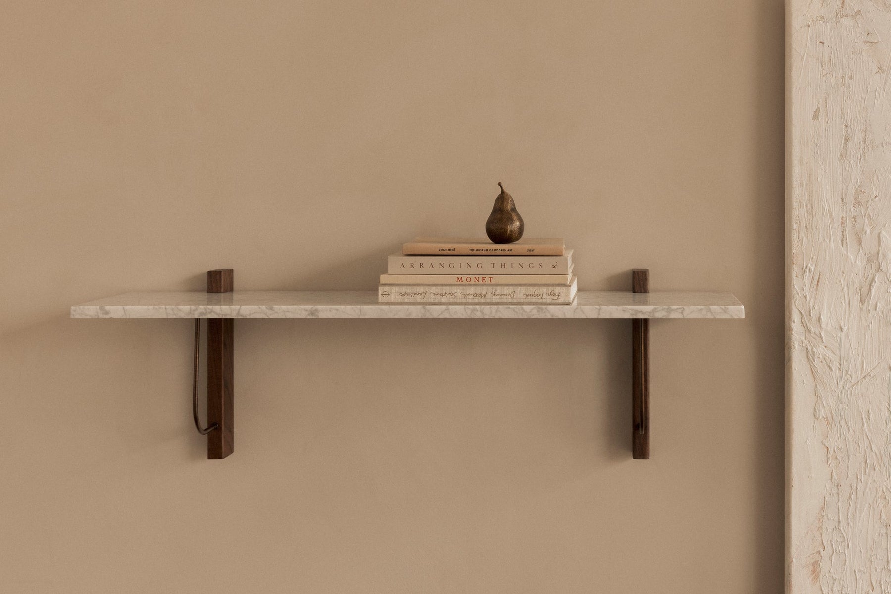 The Corbel Shelf takes its name and design cues from architectural weight-bearing brackets traditionally made from stone or wood. Designed for versatility, it serves a range of different purposes and needs in dining, kitchen and living room areas, maximizing the utility of a space and infusing the design with a sense of structural elegance. The shelf can also be paired with the corresponding desk to create a minimalist home office. thoughtfully crafted to maintain a clean and decluttered aesthetic. The small distance to the wall allows for neat cord management. The wall-mounted design is offered in marble or dark-stained oak with dark-stained oak and bronzed steel brackets, catering to different interior styles and preferences.