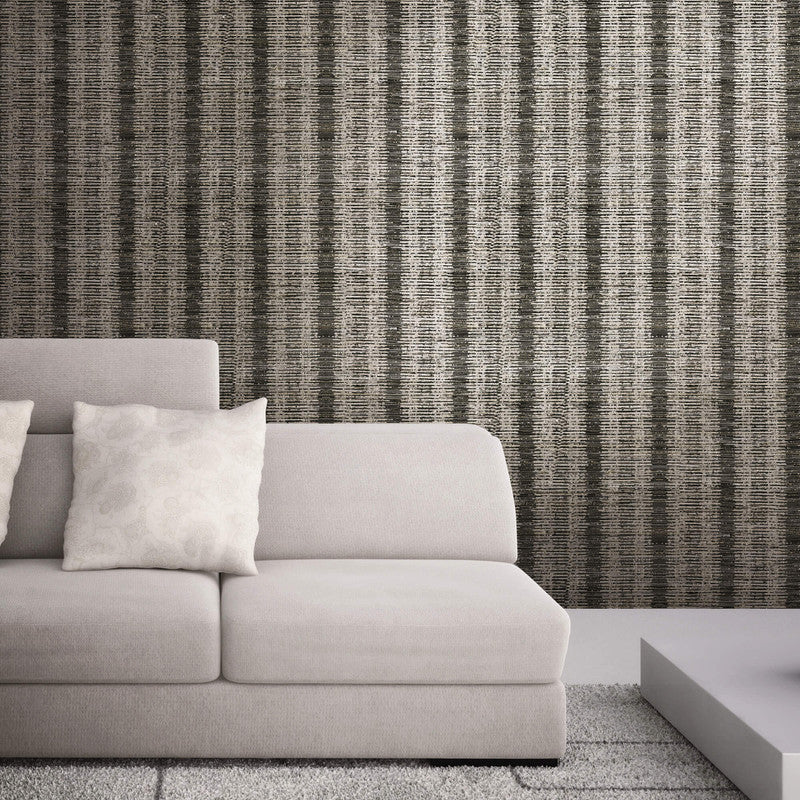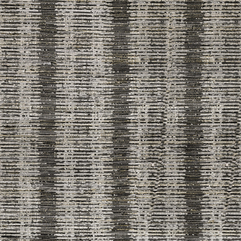 A bold vertical striae pattern printed on chunky grasscloth ground. A silver black coloration. From Indochine Vol. 2 by JF Fabrics.